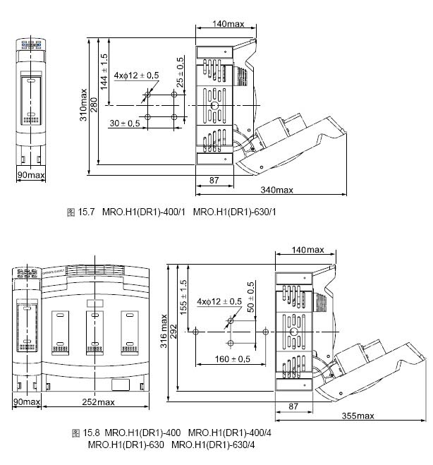 開關(guān)有底座和罩殼(載熔裝置)兩部分組成,呈封閉結(jié) 構(gòu),正面操作,通過(guò)罩殼上的透明板,可以直接觀察配裝的熔 斷體額定數(shù)據(jù)及指示件的動(dòng)作狀態(tài),開關(guān)配裝相應(yīng)尺碼的熔斷 體;其中MRO.H1(DR1)-100/1 為單極,可相互拼裝,分別派 生為三、四極,可配裝000 尺碼的熔斷體,結(jié)構(gòu)經(jīng)濟(jì),緊湊, MRO.H1(DR1)-160/1 為單極和MRO.H1(DR1)-160 為三極并列 結(jié)構(gòu),兩種結(jié)構(gòu)都能配裝000 和00 兩種尺碼的熔斷體;MRO. H1(DR1)-250/1、MRO.H1(DR1)-400/1、MRO.H1(DR1)-630/1 為單極和MRO.H1(DR1)-250、MRO.H1(DR1)-400 、MRO. H1(DR1)-630 為三極并列結(jié)構(gòu),分別配裝尺碼為1、2、3 的熔斷體。 以上的三極與同型號(hào)的單極拼裝,可派生為四極。 開關(guān)具有體積小巧、使用安全可靠、熔斷體卸裝方便、操作 力小等優(yōu)點(diǎn)。
