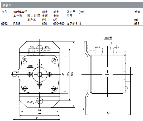 由純銀片制成的變截面熔體封裝于由高強(qiáng)度瓷制成的熔管內(nèi);熔管中充滿經(jīng)化學(xué)處理過的高純度石英砂作為滅弧介質(zhì);熔體二端采用點(diǎn)焊與觸頭牢固電連接。熔斷體型式有方管刀形觸頭和方管平板形觸頭兩種。熔斷體可帶指示器或撞擊器,當(dāng)熔體熔