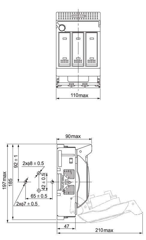 a、開關(guān)有底座和罩殼(載熔裝置)兩部分組成,呈封閉結(jié)構(gòu),正面操作,通過罩殼上的透明板,可以直接觀察配裝的熔斷體額定數(shù)據(jù)及指示件的動(dòng)作狀態(tài),開關(guān)配裝相應(yīng)尺碼的熔斷體;可與MRO.H1(DR1)160/1組合成4P模式。