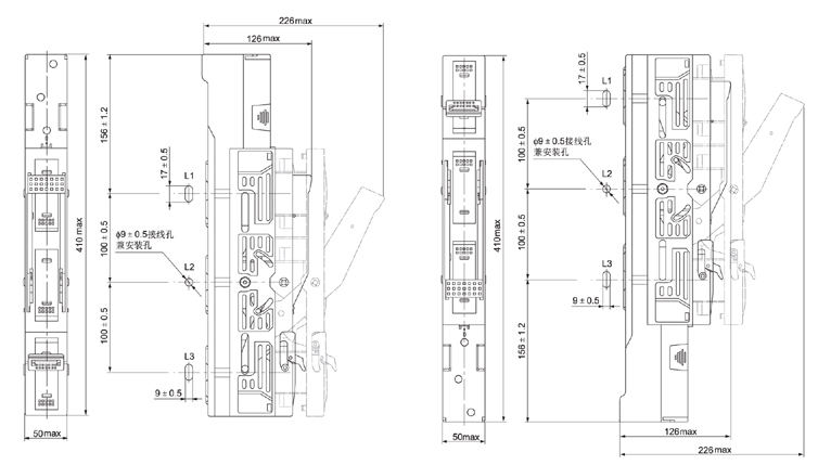b、開(kāi)關(guān)安裝方式:開(kāi)關(guān)實(shí)施模塊化設(shè)計(jì)。MRO.H2(DR2)-160寬度為50mm,利用開(kāi)關(guān)的進(jìn)線(xiàn)直接安裝在100mm母排系統(tǒng)上,分上出線(xiàn)或下出線(xiàn)兩種型式,三相同時(shí)分合,可以配裝尺碼為000或00任一種熔斷體;