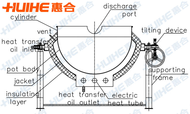 Jacketed Kettle is mainly composed of pot and tilting frame; and the pot is the double layer structure formed by inside and outside spherical pot; middle layer can add heat-conducting oil or water.
